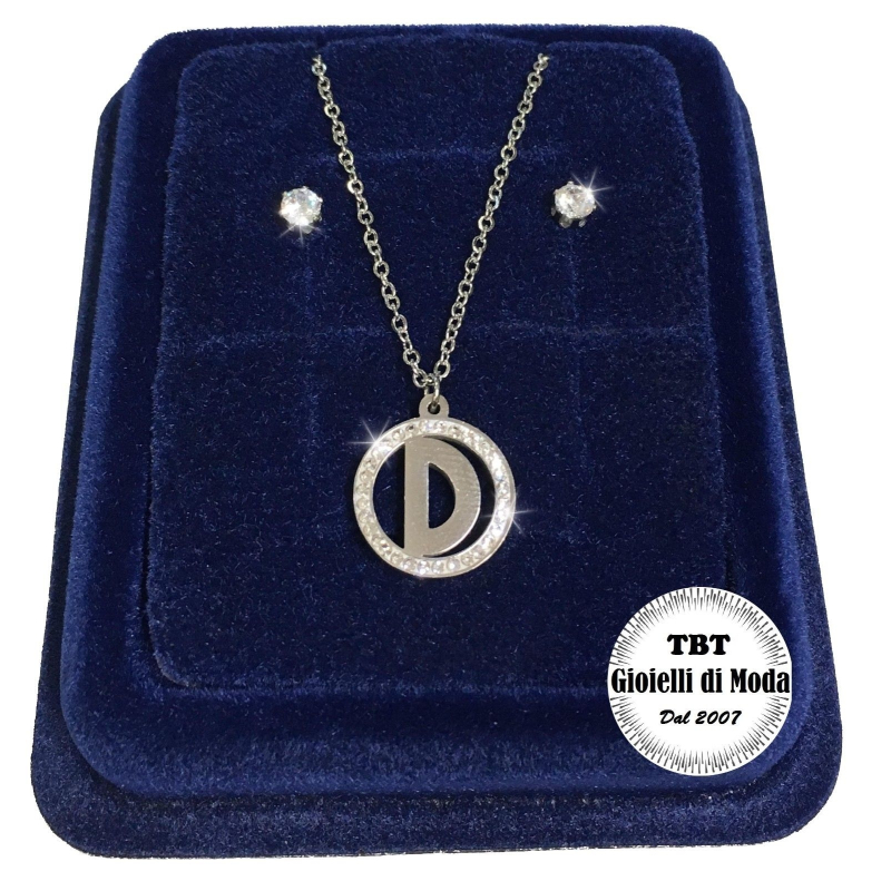 "D" Set Finissima Collana + Orecchini P.luce Lettera Iniziale Acciaio + Scatola
